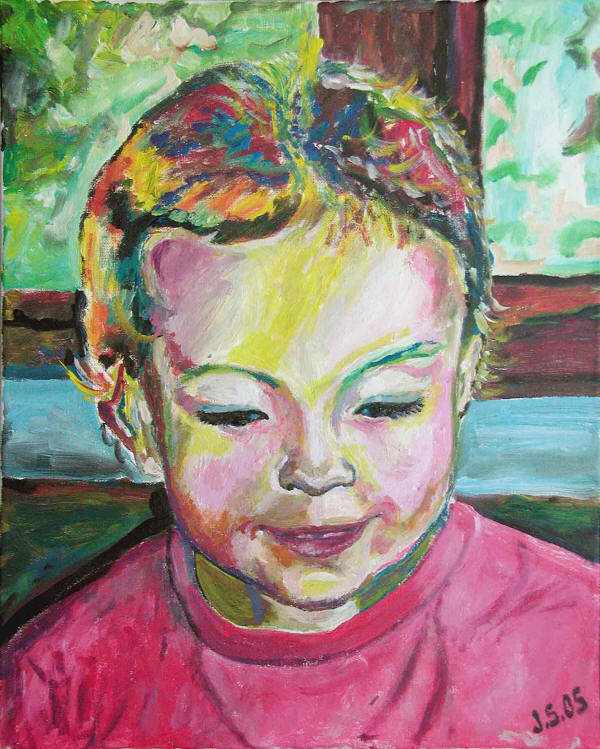 Jeg er storesøster til Celine. Min morfar er lidt af en kunstner og har lavet et maleri af mig. Det hænger i vores stue. Jeg er lidt over 4 år på dette maleri.